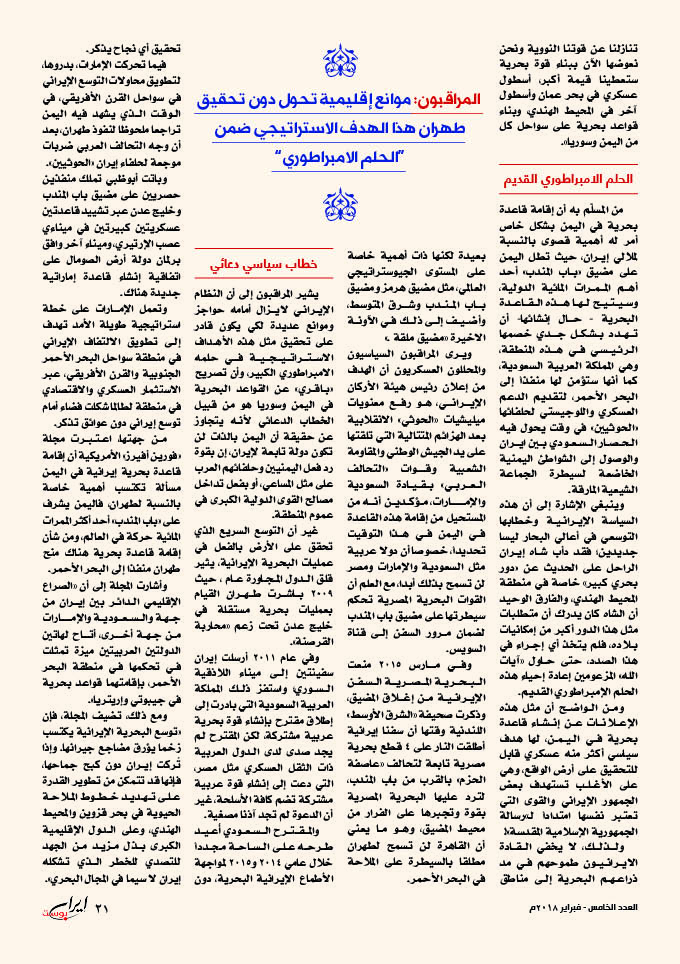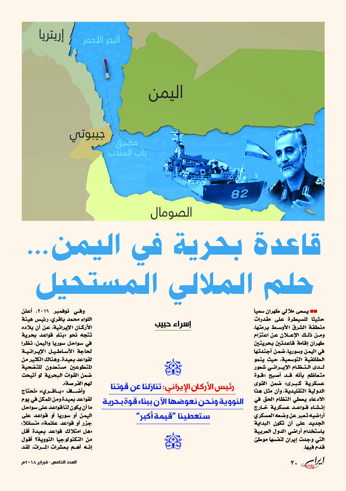 من المسلّم به أن إقامة قاعدة بحرية في اليمن بشكل خاص أمر له أهمية قصوى بالنسبة لملالي إيران، حيث تطل اليمن على مضيق "باب المندب" أحد أهم الممرات المائية الدولية، وسيتيح لها هذه القاعدة البحرية - حال إنشائها- أن تهدد بشكل جدي خصمها الرئيسي في هذه المنطقة، وهي المملكة العربية السعودية، كما أنها ستؤمن لها منفذاً إلى البحر الأحمر، لتقديم الدعم العسكري واللوجيستي لحلفائها "الحوثيين" في وقت يحول فيه الحصار السعودي بين ايران والوصول إلى الشواطئ اليمنية الخاضعة لسيطرة الجماعة الشيعية المارقة.
