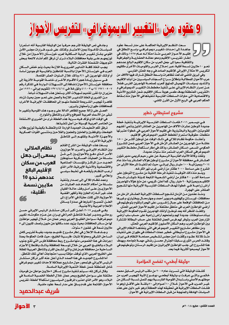 سعت النظم الإيرانية الحاكمة على مدار تسعة عقود جاهدة إلى إحداث «تغيير ديموغرافي» واسع النطاق في إقليم الأحواز العربي منذ احتلاله عام 1925، وذلك في إطار «تفريس» الإقليم ومحو معالمه الحضارية والجغرافية والثقافية، سعيا إلى جعل العرب من سكان الإقليم البالغ عددهم نحو 10 ملايين نسمة أقلية، عبر إحلال الفرس والقوميات الأخرى مكانهم، لتكريس الاحتلال الإيراني للإقليم الصامد في وجه المحتل الفارسي.