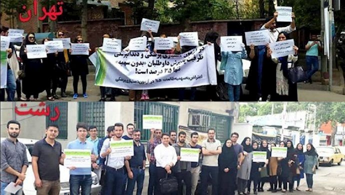 نظم المشاركون في اختبار مهنة مساعد الطبيب تجمعاً احتجاجياً يوم الأحد 3 حزيران في مدن طهران وشيراز وأصفهان ورشت و مشهد والأحواز للاحتجاج على نسبة الحصة 5 بالمائة المخصصة لعوائل ضحايا الحرب الخيانية.