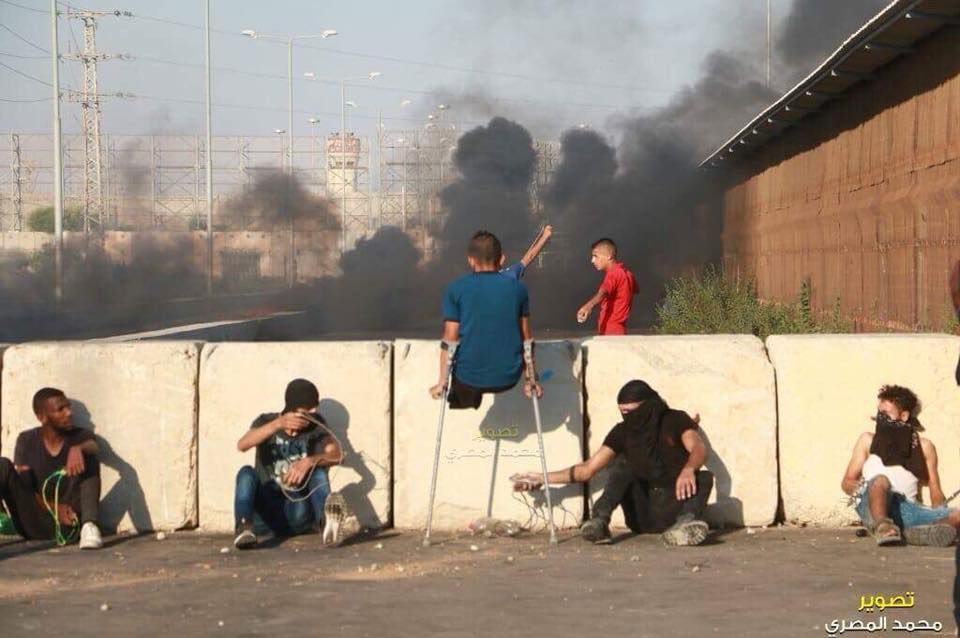 صورة وتعليق|"نحن لا نهزم".. شاب جريح مبتور القدمين يشارك في المواجهات مع قوات الاحتلال أمام حاجز بيت حانون مساء أمس
