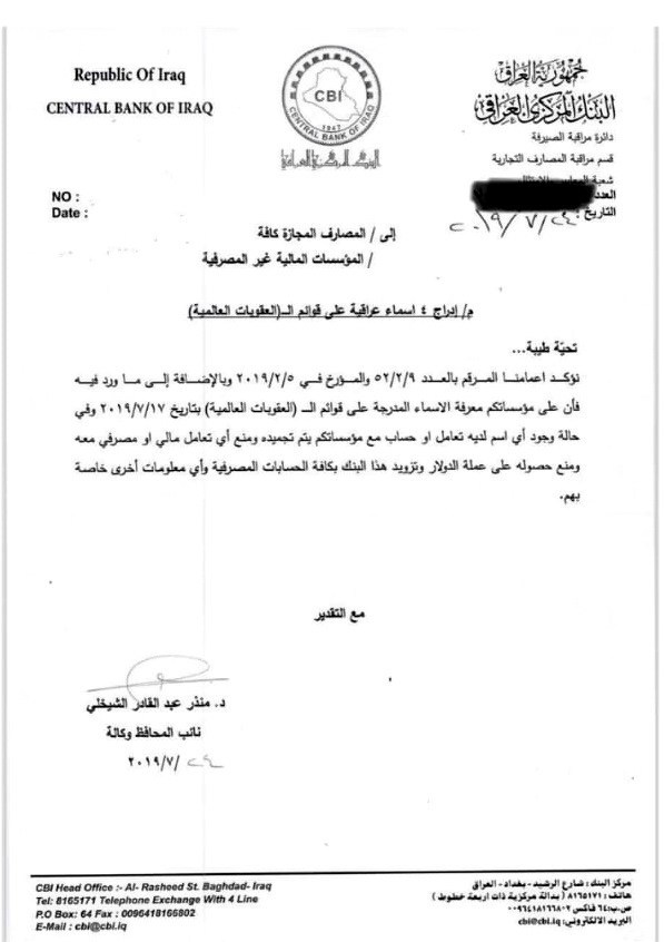 بعدما أصدر البنك المركزي العراقي، الخميس، تعميماً إلى بقية المصارف والجهات المالية، حول عدم جواز التعامل المالي بحق 4 شخصيات عراقية هم: اثنان من قادة الميليشيات ريان الكلداني ووعد قادو، واثنان من المحافظين العراقيين السابقين، هما نوفل حمادي السلطان وأحمد الجبوري صدرت بحقهم عقوبات أميركية قبل أيام، أكدت أغلب الدوائر القريبة من الشخصيات والجهات العراقية المرتبطة بـ"الحرس الثوري" الإيراني، أن أعداداً كبيرة منهم باتت تشعر بخطر حقيقي على مصالحها، وحركة أموالها في العراق.