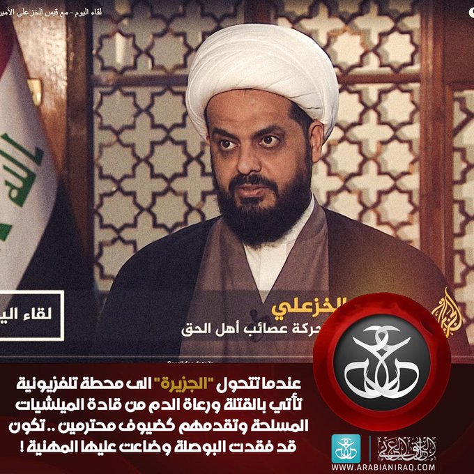 قناة الجزيرة هي منصة لدعم الإرهابيين. هذا هو قيس الخزعلي، قائد ميليشيات عصائب أهل الحق الإرهابية في العراق، التابعة لإيران، والذي يقتل المتظاهرين المسالمين في العراق. أجرت قناة الجزيرة مقابلة معه حول موقفه من قائمة العقوبات من قبل وزارة الخزانة الأميركية. #قطر تدعم الإرهاب بالمال ووسائل الإعلام.