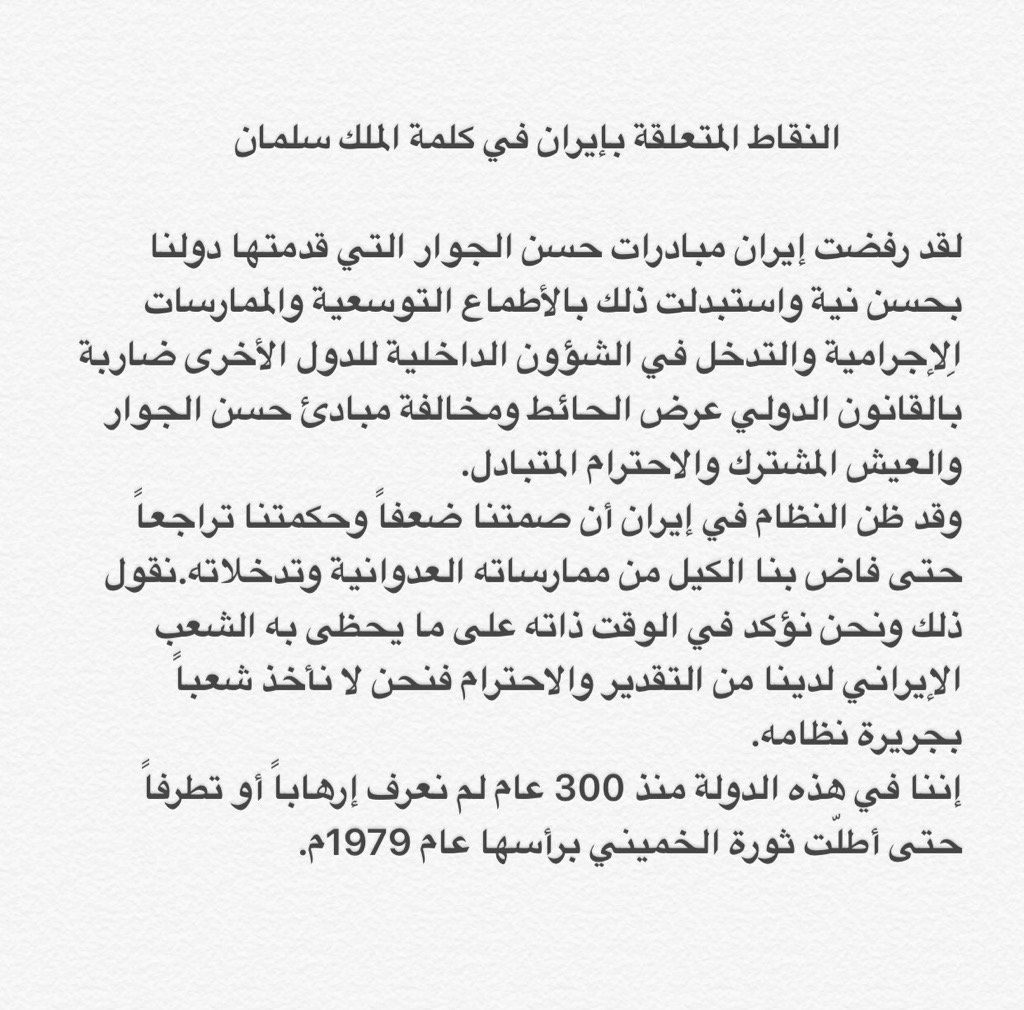 هاجم خادم الحرمين الشريفين الملك سلمان بن عبد العزيز النظام الإيراني، ووصفه بأنه "رأس حربة الإرهاب العالمي منذ ثورة الخميني وحتى اليوم"، مؤكدا عزم المملكة على القضاء على "كل التنظيمات الإرهابية أيا كان دينها أو مذهبها أو فكرها".