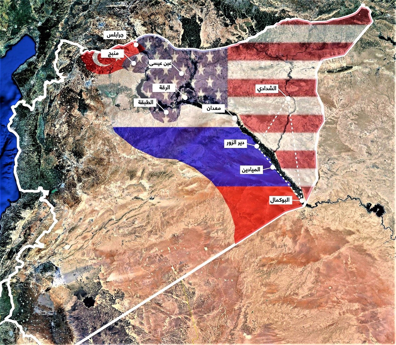 كتب موقع "ديبكا"، الاستخباري الإسرائيلي، أن إدارة ترامب بنت "جدارا" على طول الحدود السورية البالغ طولها 1320 كيلومترا مع العراق والأردن وتركيا. فهناك حوالي 2500 من مشاة البحرية الأمريكية يقفون على طول خط يمتد شمالا من تقاطع الحدود السورية - العراقية - الأردنية على طول الحدود العراقية في الشرق (1000 كم) ويتحول شمالا إلى الحسكة ومنبج ليتوازوا مع الحدود الشمالية السورية مع تركيا (320km).