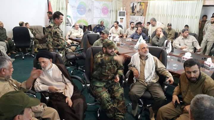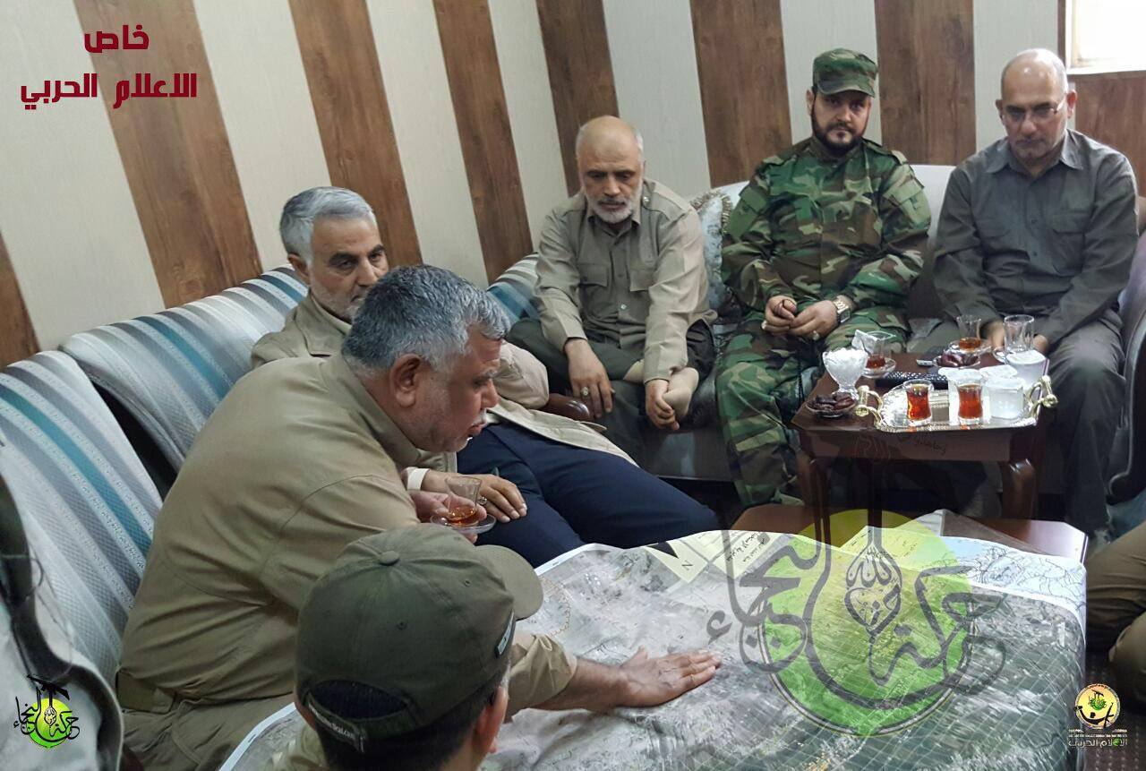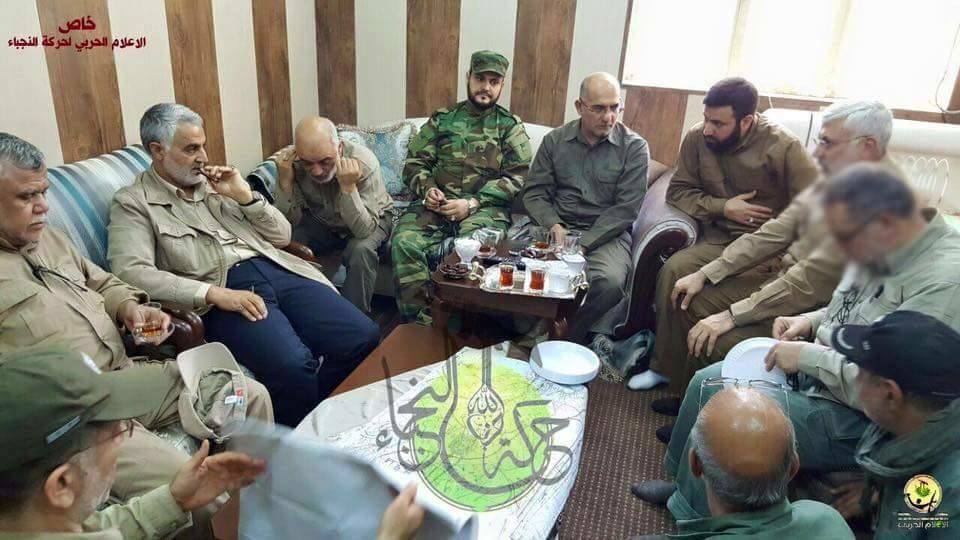 ونشرت صفحة مليشيا "حركة النجباء" على "فيسبوك" صورا لقائد فيلق القدس الإيراني وهو يناقش معركة الفلوجة داخل غرفة عملياتها العسكرية، وفي مجلسه قائد مليشيا بدر العراقية المجرم هادي العامري ونائب رئيس مليشيات الحشد الشعبي المجرم أبو مهدي المهندس وعدد من قادة المليشيات العراقية.