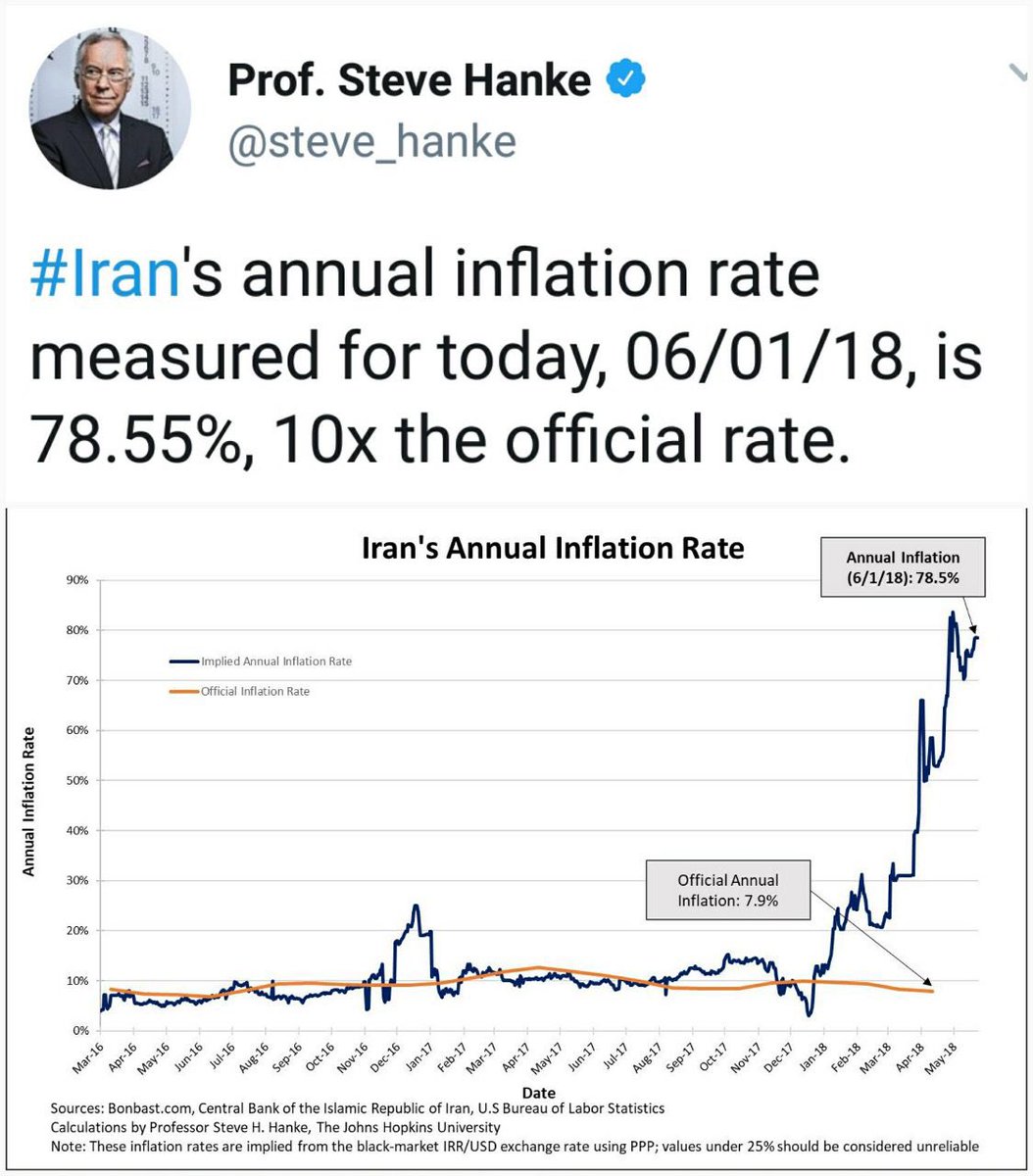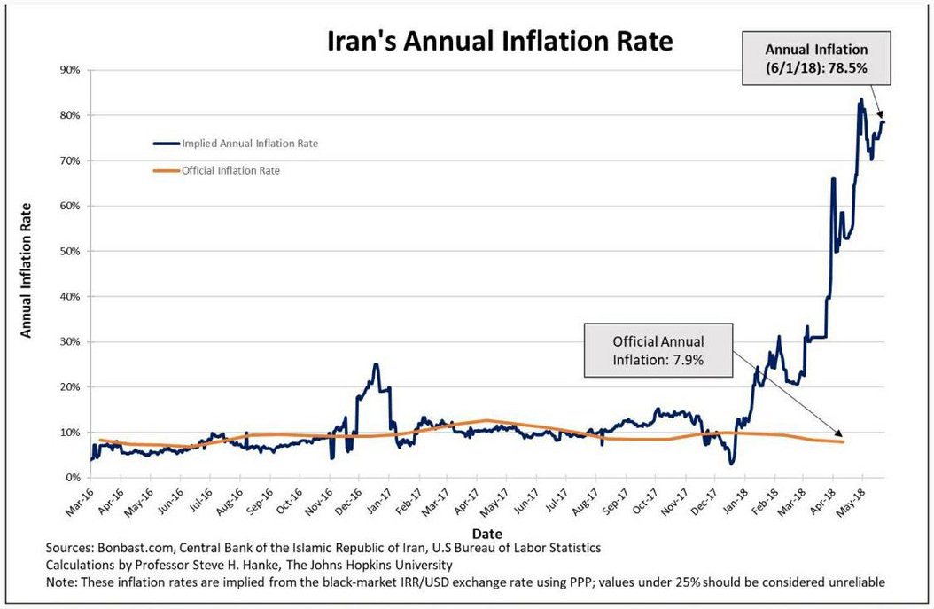 قال أستاذ الاقتصاد بجامعة جانز هبكينز الأمريكية، البرفسور ستیف هانک على موقع التغريدات المصغر "تويرت": إن التضخم الحقيقي في إيران وصل 78/55 نقطة نتيجة تراجع قيمة التومان مقابل الدولار مطلع العام الجاري.