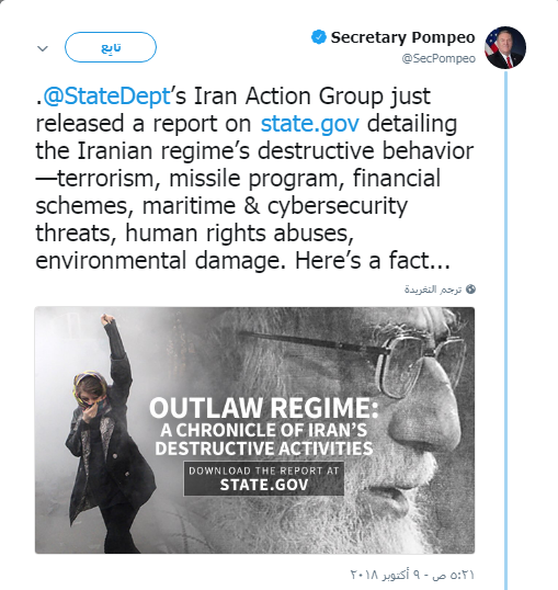 ويحتوي التقرير على تفاصيل السلوك المدمر للنظام الإيراني في المنطقة من خلال تمويل ودعم الإرهاب وبرنامج الصواريخ والالتفاف على العقوبات والتهديدات البحرية والأمنية وانتهاكات حقوق الإنسان والأضرار البيئية.