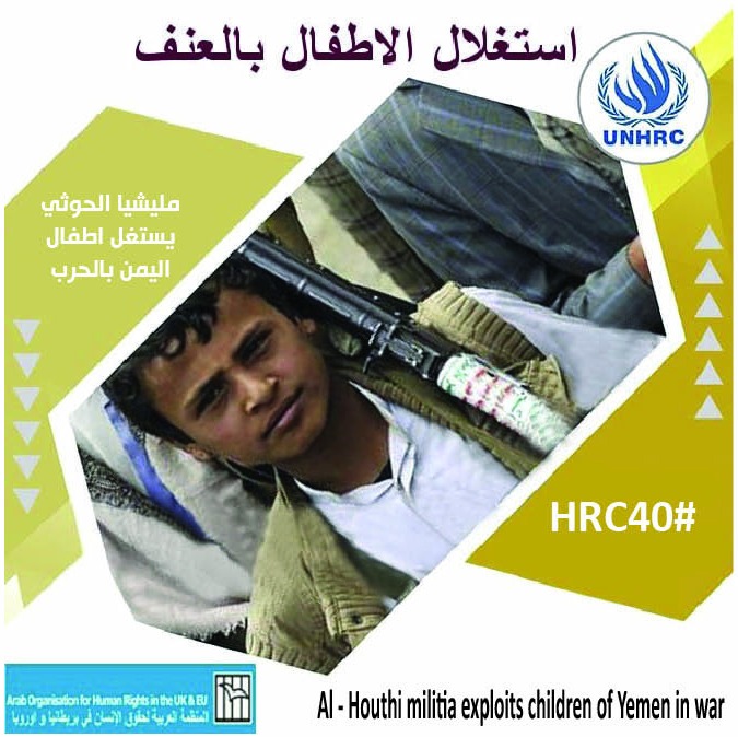 عقد المنظمة العربية لحقوق الإنسان في بريطانيا وأوروبا والمنظمة الإفريقية وشخصيات حقوقية ندوة يوم أمس الأربعاء 13 أبريل 2019 في مجلس حقوق الانسان الدورة 40 بجنيف حول " استغلال مليشيا الحوثي الانقلابية اطفال اليمن في الحرب".