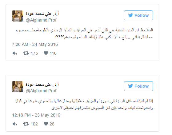 قال الدكتور علي محمد عودة - الأستاذ المتخصص في تاريخ الحروب الصليبية - إن الملاحظ أن المدن السنية هي التي تدمر في العراق والشام، ومنها «الرمادي، الفلوجة، حلب، حمص، حماة، الزبداني ...إلخ»، متسائلا: «ألا يكفي هذا لإيقاظ السنة وتوحدهم؟».