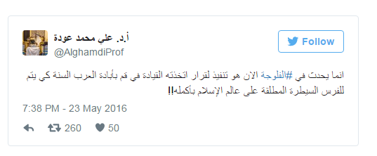 واستبق بالقول في تغريدات له على حسابه بـ«تويتر»، بالتأكيد على أن الفصائل السنية في سوريا والعراق إن لم ينبذوا خلافاتهم ومنازعاتهم وينضوا طوعا في كيان واحد وتحت قيادة واحدة فإن نار المجوس ستحرقهم واحدة تلوالأخرى.
