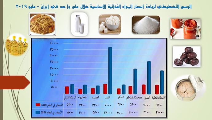 إنفوجراف تخطيطي لزيادة أسعار المواد الغذائية الأساسية خلال عام واحد في إيران