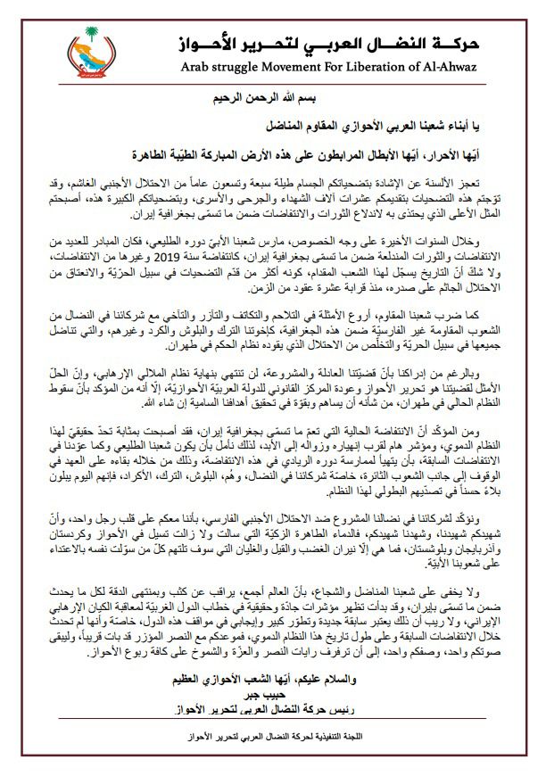 أصدرت حركة النضال العربي لتحرير الأحواز بيانًا باسم رئيس الحركة حبيب جبر حول ضرورة مشاركة الأحوازيين في الانتفاضة الأخيرة في عموم جغرافيا ما تسمى إيران ضد نظام الملالي.