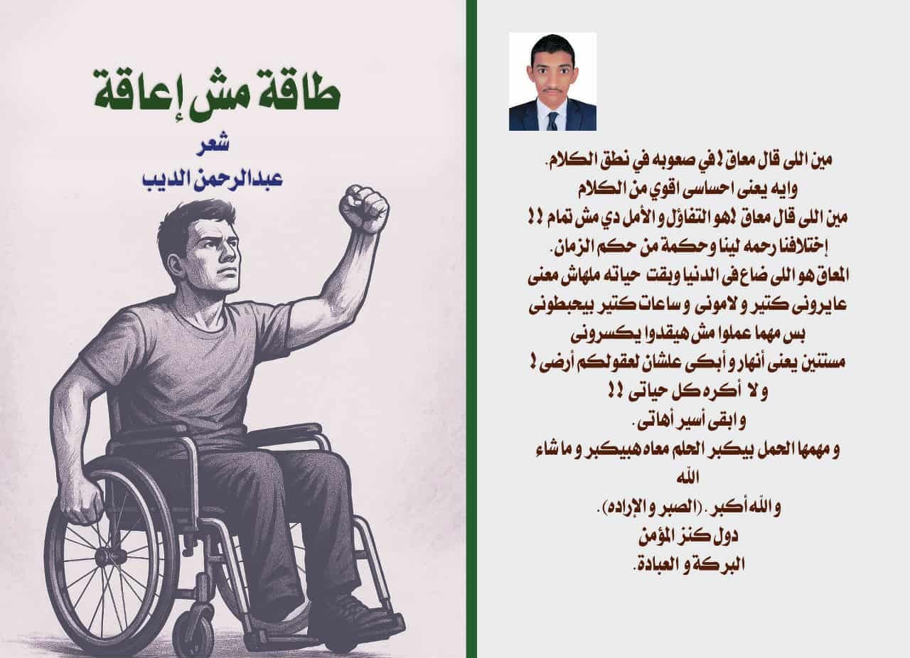 أصدر الشاعر الشاب عبد الرحمن أحمد الديب، ابن محافظة سوهاج ومن ذوي الهمم، ديوانه الشعري الأول بعنوان "طاقة مش إعاقة"، وذلك في تجربة أدبية فريدة تجسد الإرادة والتحدي، ودر في كيفية تحويل المعاناة إلى إبداع ملهم.